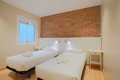Este apartamento vacacional de 115 m² puede alojar hasta diez personas, con cuatro dormitorios, dos baños, salón comedor, cocina totalmente equipada y un pequeño balcón.