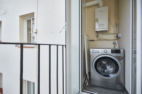 FIRA V es un apartamento recientemente reformado, ubicado en una tranquila calle a escasos metros del Palacio de Montjuïc, del recinto ferial de la Fira y de Plaza de España. Se encuentra en la tercera planta de una finca regia construida en 1955.